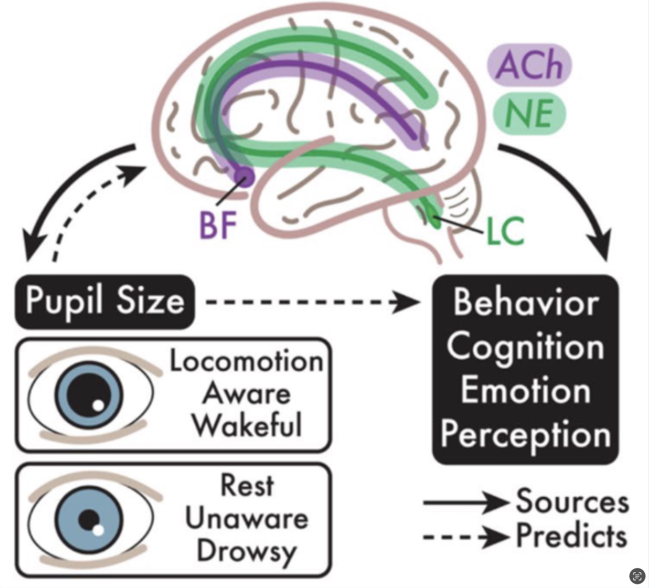 Figure 1: Pupil size is closely linked to the locus coeruleus noradrenergic and basal forebrain cholinergic systems. When there is increased locus coeruleus activity, this would cause increased pupil dilation independent of lighting or external stimuli. As these neuromodulatory systems have widespread influence across the brain, pupil size serves as a marker of broad neural activity, reflecting both conscious and unconscious sensory processing.